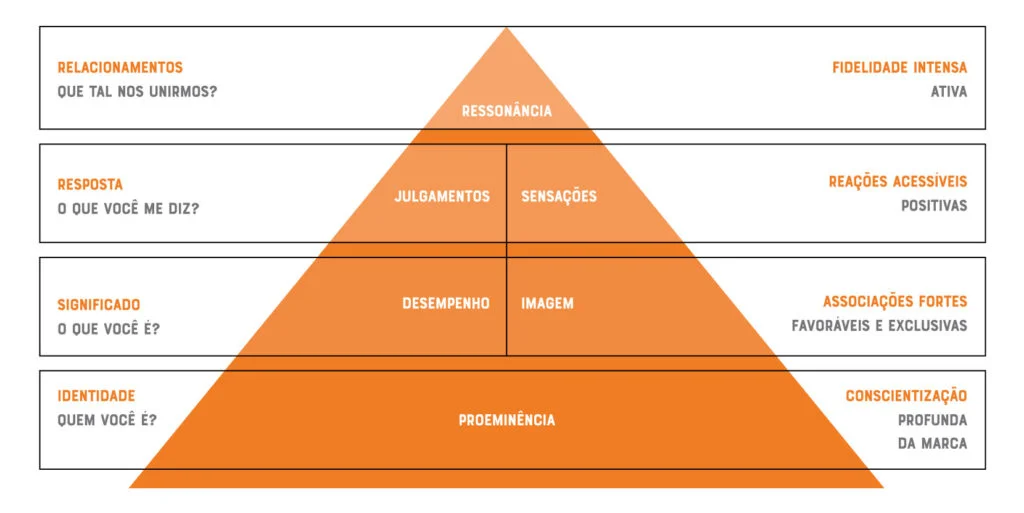 No topo da pirâmide está a ressonância. É quando a relação deixa de ser apenas transacional e passa a ser contínua. O cliente não apenas compra, mas retorna, recomenda e se envolve com a marca. Esse nível representa lealdade, engajamento e um relacionamento mais profundo — resultado direto de um brand equity bem construído.